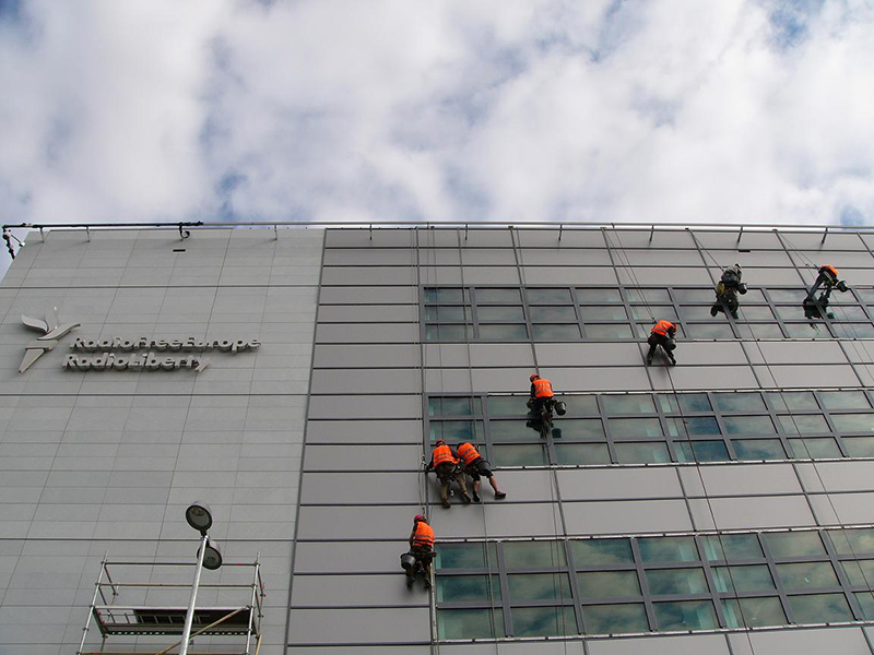 RADIO FREE EUROPE/RADIO LIBERTE – demontáž a montáž lišt rastrové fasády horolezeckou technikou