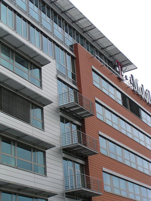 T-MOBILE – kompletní mytí prosklených fasád zevnitř a zvenčí budovy, AL a keramických prvků horolezeckou technikou a ze závěsné plošiny