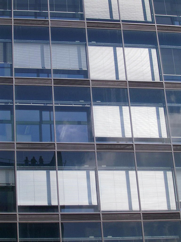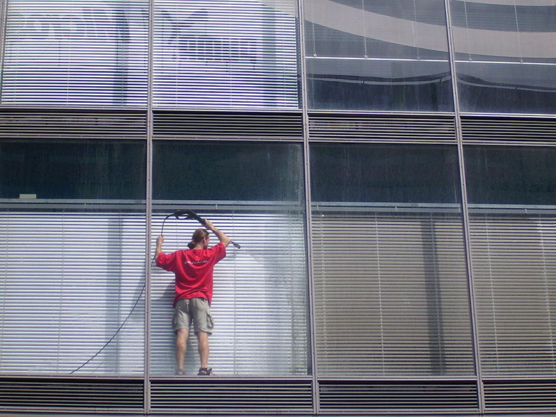 GENERAL ELECTRIC – kompletní mytí prosklených fasád zevnitř a zvenčí budovy, AL plechu, omítky, kamenného obkladu a žaluzií regulovanou vysokotlakou vodou